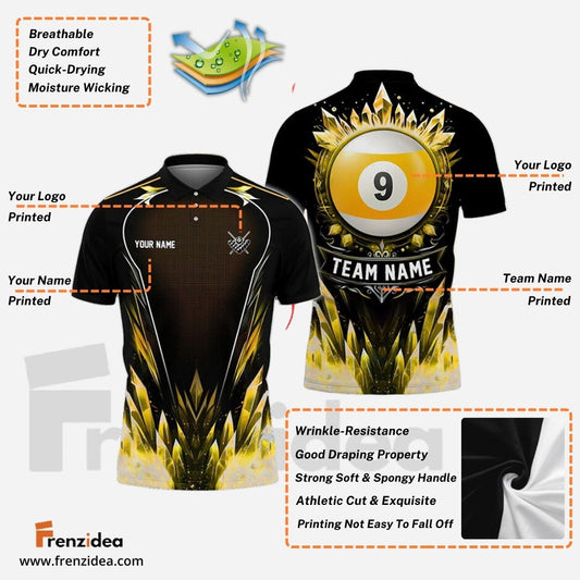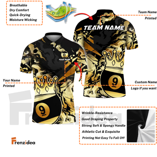 Frenzidea Billiards Ball 9 King Crown Golden Pattern Personalized Name & Team Name Shirt (4 Colors)