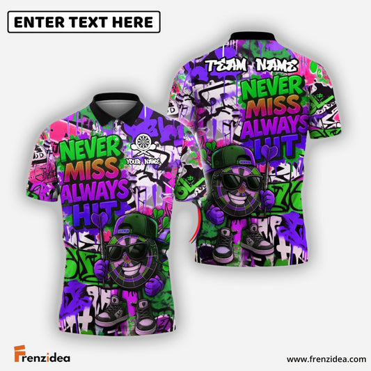 Frenzidea Darts “Never Miss, Always Hit” Dartboard Street Personalized Name, Team Name Shirt (4 Colors)