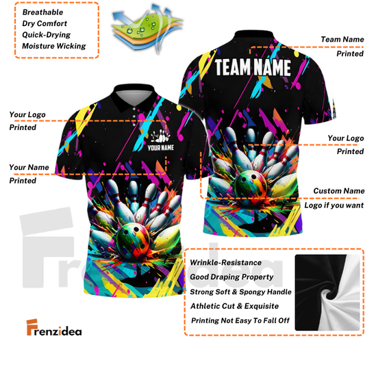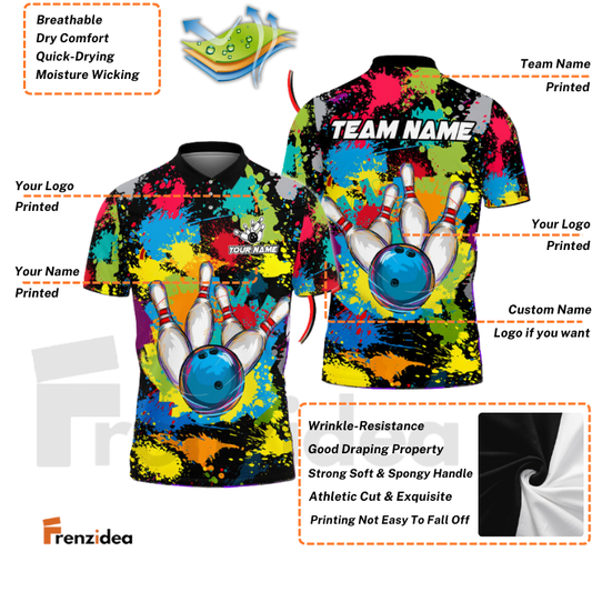 Frenzidea Bowling Coloful Ink Pattern Customized Name, Team Name 3D Shirt