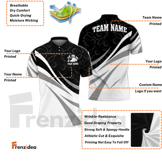 Frenzidea Bowling And Pins US Flag Bowling Pattern Customized Name, Team Name 3D Shirt (Black & White)
