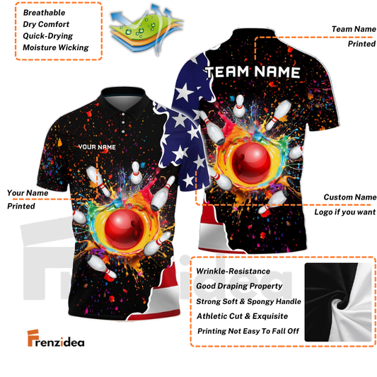 Frenzidea Bowling And Pins Colorful Paint Flag Personalized Name Team Name 3D Shirt